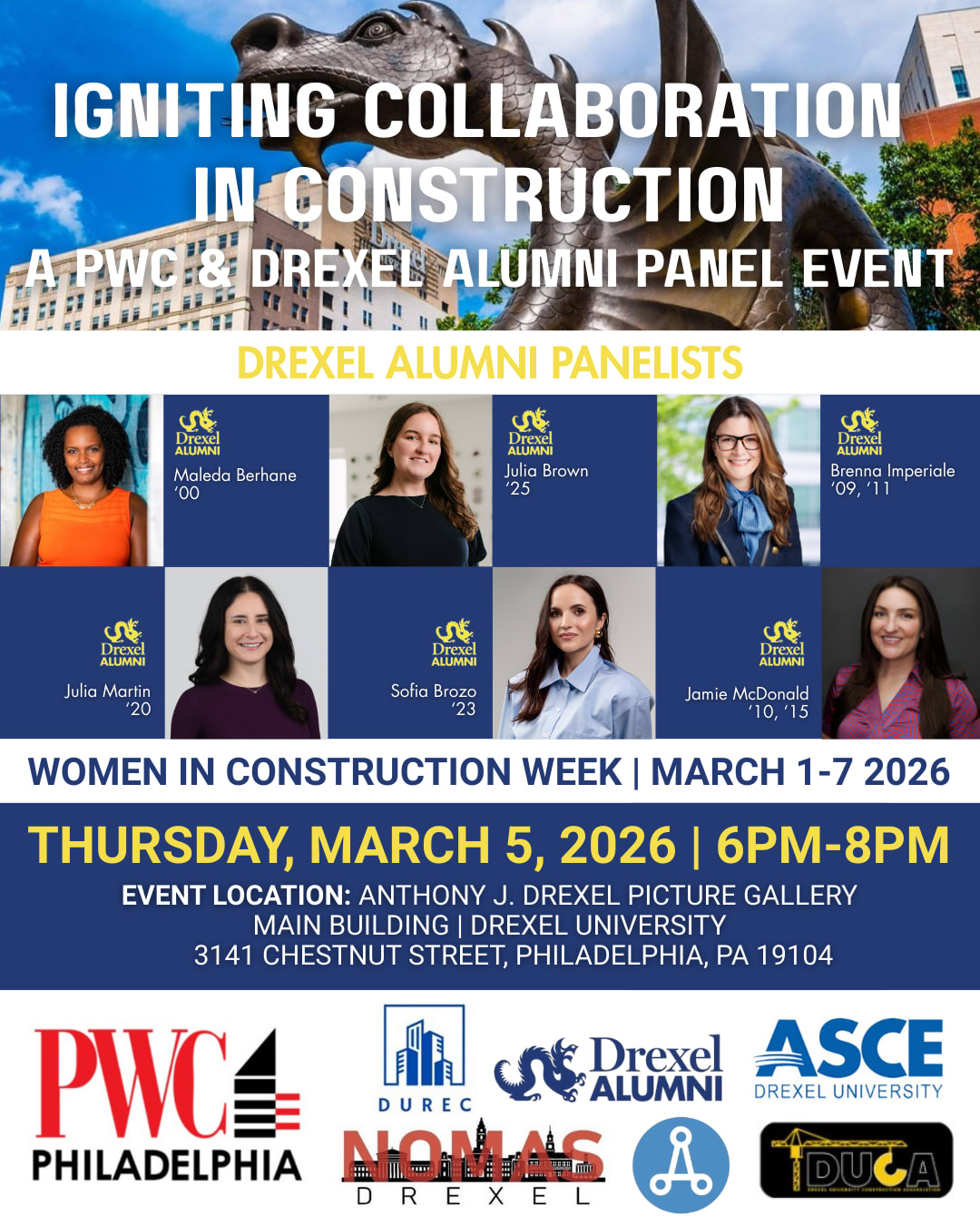 Join us for Igniting Collaboration in Construction – an event brought together by Philadelphia Women in Construction (PWC), Drexel Alumni and Student run organizations for a panel held at Drexel University during Women in Construction Week. This engaging session features four accomplished Drexel alumni panelists and a dynamic moderator discussing the power of collaboration in the construction industry. Panelists will also share valuable advice and recommendations for graduating students and young professionals looking to build successful careers. This event is proudly presented in partnership with Drexel’s student-run organizations and the Drexel Alumni Office, fostering connections between current students, alumni, and industry leaders. Don’t miss this opportunity to network, learn, and be inspired! Student Organizations include DUCA, DUREC, AIAS, NOMAS, DUASCE, SHE and Lebow Bridge.